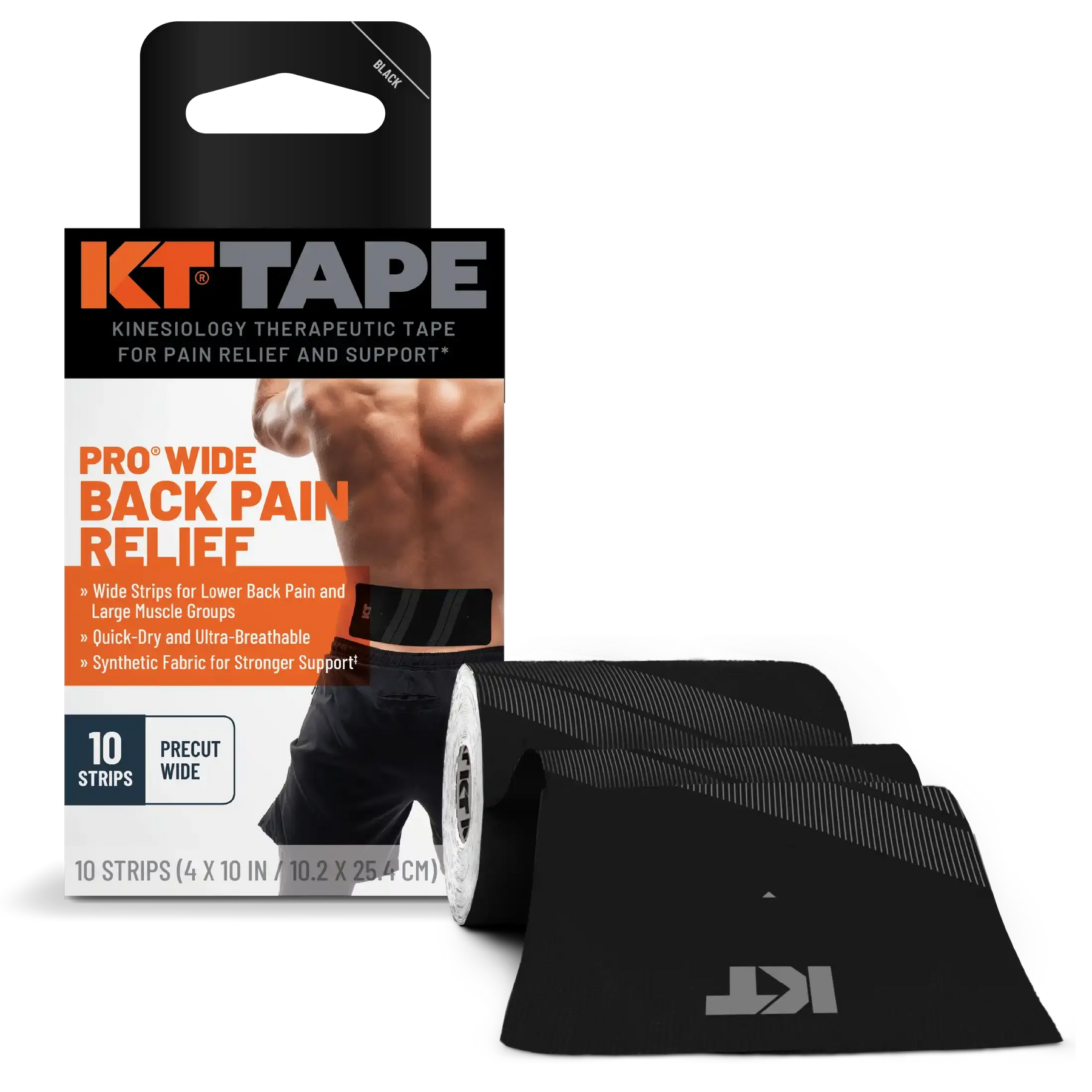 KT Tape® Pro Wide™ is pre-cut and ready to apply right out of the box. Pre-cut strips have rounded corners which help to prevent the corners from catching on clothing or the edges fraying. Each roll contains 10 pre-cut strips that are 10 inches long and 4 inches wide, double the width of our KT Tape Pro®.